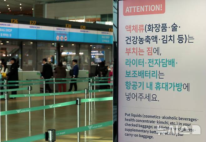 14일 오후 인천국제공항 제2여객터미널에 라이터, 배터리 기내 반입 유의사항 안내가 게시되어 있다.