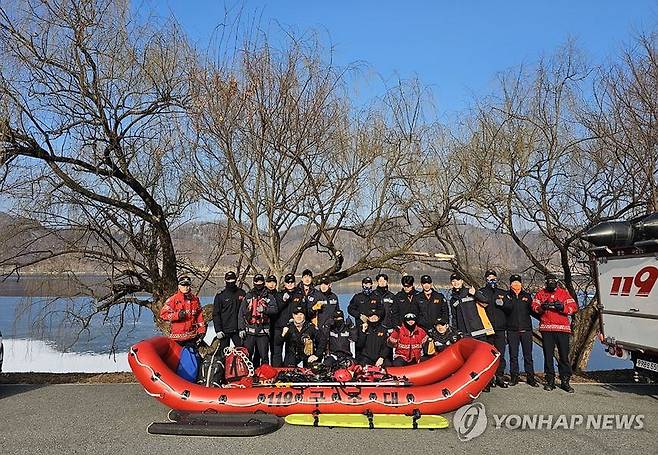 (춘천=연합뉴스) 14일 강원 춘천시 송암동 일대에서 춘천소방서가 해빙기(2∼4월) 수난사고 대비 인명구조 훈련 기념 촬영을 하고 있다.