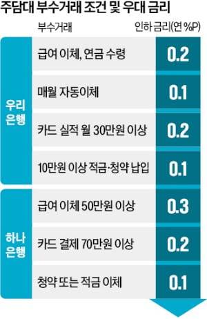 예를 들어 우리은행은 이번 감면 금리 조건에 급여 이체, 연금 수령, 매월 카드 30만원 이상 사용, 월 10만원 이상 적금이나 청약 납입 등을 줄줄이 달아놨다.