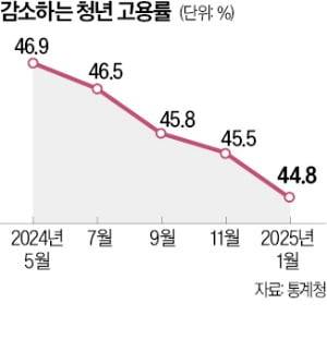 청년 고용률은 지난해 5월 이후 9개월째 내리막을 걷고 있다. 1월 고용률은 44.8%로 45% 밑으로 내려왔다. 가장 큰 요인은 지난해 말 비상계엄 사태 등으로 기업의 고용심리가 위축된 점이다. 그런 데다 기업이 신입보다 당장 업무에 투입할 수 있는 경력직 채용을 선호해 앞으로도 청년 취업자가 줄어들 가능성이 높다는 관측이 나온다. 통계청 관계자는 “수시 채용, 경력 채용이 늘어난 점이 청년에게 불리하게 작용하고 있다”고 말했다.