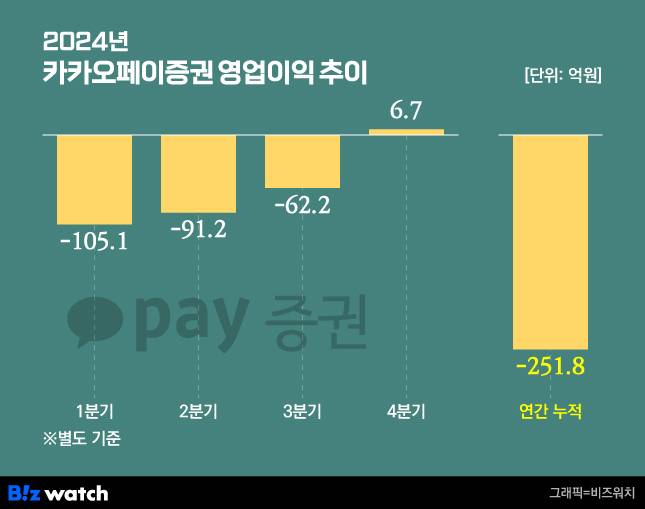 분기로 따졌을 때 1분기 105억원의 손실을 기록한 후 적자를 점점 줄여나간 흐름이다. 2분기와 3분기 영업손실은 각각 91억, 62억원으로 집계됐다. 4분기에는 6억원으로 흑자를 달성했다. 카카오페이증권이 출범한 이래 첫 분기 흑자다.