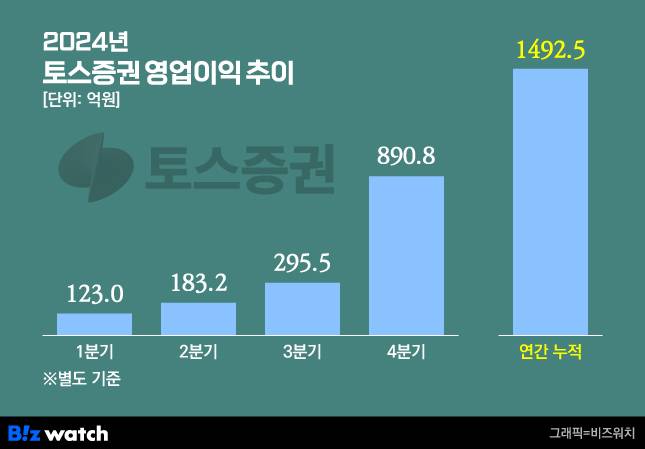 토스증권은 지난해 4개 분기 연속 흑자를 기록하며 부침없이 온전히 흑자 기조로 돌아선 모습이다. 1분기와 2분기 각 100억원대 흑자를 시현했고 3분기에는 300억원을 달성했다. 특히 4분기에는 한해 영업이익이 60% 가량인 890억원의 흑자를 거두며 갈수록 단단힌 실적을 보였다.