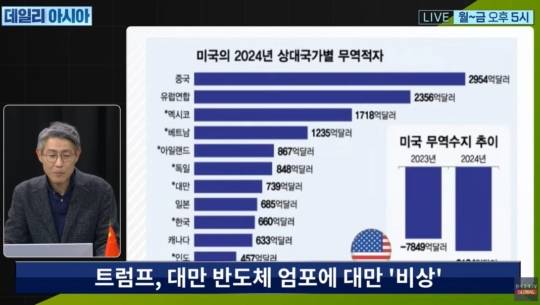 트럼프 입장에서 미국 기업 인텔은 적자를 보고 있는 마당에 대만 기업 TSMC가 대미 수출로 대규모 흑자를 보고 있는 게 못마땅한거죠.