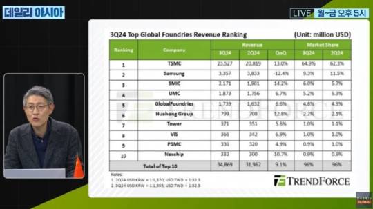 트렌드포스에 따르면 지난해 3분기 기준 글로벌 파운드리 시장에서 TSMC는 점유율이 65%에 달했습니다.