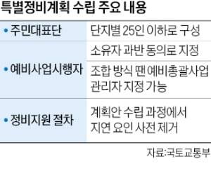 또 특별정비계획 수립 기간 단축을 위해 주민대표단을 구성하고, 예비사업시행자 또는 예비총괄사업관리자를 지정하도록 했다. 계획안 수립 과정에서 소유자, 지방자치단체, 시행사가 미리 관련 내용을 협의해 인허가 과정에서 사업 지연 요인을 사전에 제거할 수 있게 했다.