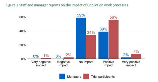 AI가 실제 업무 프로세스에 미친 영향을 분석한 결과에서도 유사한 경향이 나타났다. 관리자와 실험 참가자의 평가를 비교한 결과, 관리자의 59%가 코파일럿이 업무에 아무런 영향을 미치지 않았다고 답한 반면, 실험 참가자의 56%는 긍정적인 영향을 주었다고 응답했다. Copilot이 매우 긍정적인 영향을 주었다고 답한 비율은 관리자 2%보다 실험 참가자가 7%로 더 높았다. 반면, 부정적인 영향을 주었다고 답한 비율은 매우 낮아, AI가 업무에 미치는 부정적 요소는 크지 않은 것으로 나타났다.