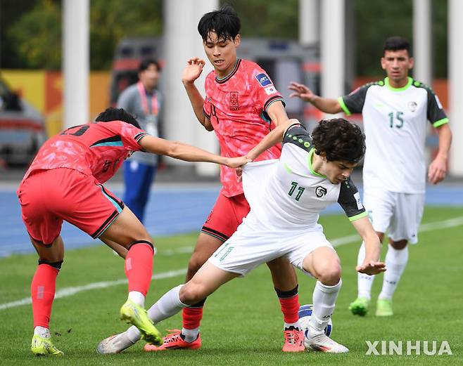 [선전=신화/뉴시스] 조현우(가운데)와 김태원이 14일(현지 시간) 중국 광둥성 선전의 룽화 문화체육센터 스타디움에서 열린 아시아축구연맹(AFC) 20세 이하(U-20) 아시안컵 조별리그 D조 1차전 시리아와 경기 중 수비하고있다. 이창원 감독이 이끄는 한국은 성신의 1골 1도움 활약과 백민규의 결승 골로 2-1 승리를 거뒀다. 2025.02.15.