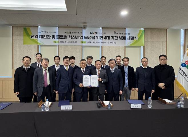 김해의생명산업진흥원과 한국전기연구원, 한국재료연구원, 창원산업진흥원(이하 '4대 기관')이 지난 14일 지역 산업 혁신과 중소 중견기업의 글로벌경쟁력을 강화하고자 서로 협약을 맺었다.