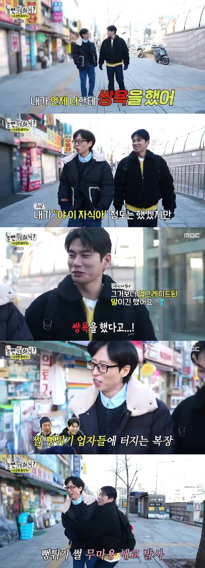 이날 이이경과 함께 거리를 걸으며 심은경이 있는 장소로 향하던 유재석은 "내가 언제 너한테 쌍욕을 했냐"고 발끈했고, 이이경은 "했다. 방송이라 말을 못 한다"며 억울해했다.