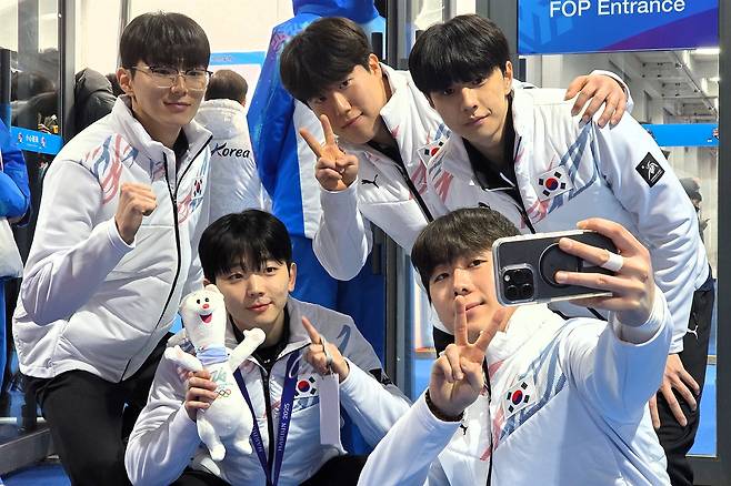 | ▲ 2025 하얼빈 동계 아시안 게임에서 은메달을 따낸 남자 컬링 대표팀 의성군청 선수들이 2026 밀라노-코르티나담페초 동계 올림픽 마스코트와 함께 '셀카'를 찍고 있다. 왼쪽 위부터 시계 방향으로 표정민·김진훈·김효준·김은빈·이재범 선수. |