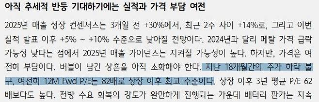 해당 리포트를 보면 “지난 18개월간의 주가 하락 불구, 여전히 12개월 선행 PER은 82배로 상장 이후 최고 수준”이라고 지적했습니다. PER을 기준으로 보면, 업종을 불문하고 82배라는 수치 자체가 상당히 높은 것이 맞습니다.