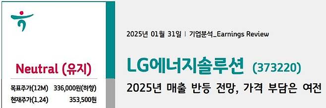 하지만 그 중에 하나 눈길을 끈 리포트가 있었는데요, 하나증권 김현수 연구원의 LG에너지솔루션에 대한 보고서입니다. 김 연구원은 ‘가격 부담’을 제목에 명시했습니다.
