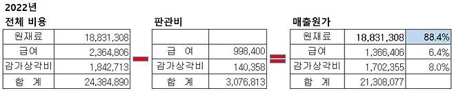 (회계를 잘 아시는 독자는 ‘비용의 성격별 분류’ 가운데 ‘제품, 반제품, 상품 및 재공품의 변동’에서도 감가상각비와 인건비를 발라내야 한다고 지적하실 수 있습니다. 하지만 그 금액 규모가 비교적 작고 큰 틀의 설명을 하는데 영향을 주지 않기 때문에 장부상 표기된 분류를 그대로 사용했습니다)