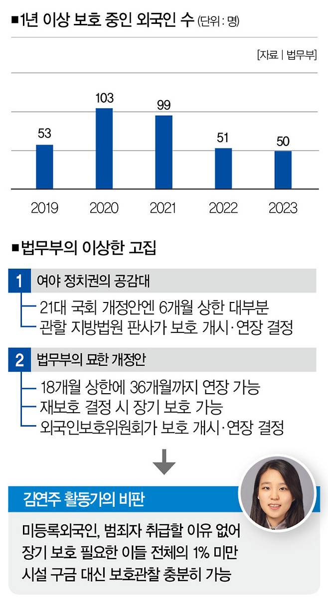 국회 법제사법위원회는 지난해 11월과 올해 1월 두차례에 걸쳐 출입국관리법 개정안을 논의했다. 당시 판사 출신인 장동혁 국민의힘 의원은 "형집행이 끝난 이들을 왜 계속해서 보호소에 두고 관리하느냐"면서 36개월까지 연장할 수 있도록 만든 정부안이 타당하지 않다고 비판했다.