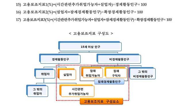 고용보조지표3은 '경제활동인구'와 '잠재취업가능자'(구직활동을 했지만 사정이 생겨 일을 할 수 없는 이)· '잠재구직자'(일을 할 수 있으나 4주간 구직활동을 하지 않은 이)를 포함하는 '잠재경제활동인구' 대비 '시간 관련 추가 취업 가능자'와 실업자, 잠재경제활동인구를 더한 수치의 비율로 산출됩니다.