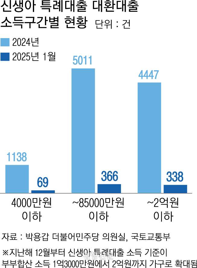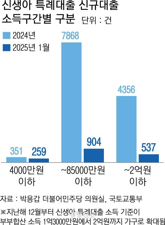 국회 국토교통위원회 소속 박용갑 더불어민주당 의원이 16일 국토교통부에서 받은 ‘신생아 특례 대출 현황’ 자료를 보면, 지난해 고소득층(연 소득 8500만원 초과~2억원 이하)에서 신생아 특례대출을 받은 건수는 총 4356건으로, 저소득층(연 소득 4000만원 이하) 2351건의 1.8배 수준인 것으로 집계됐다.