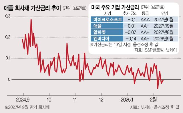 미국 도널드 트럼프 행정부 출범 이후 글로벌 관세 전쟁 등 불확실성이 커지면서 미국 빅테크 등 우량 기업 회사채에 대한 선호도가 높아지고 있다. 이런 가운데 애플과 마이크로소프트(MS) 등 고신용 기업이 발행한 회사채의 국채 대비 스프레드(가산금리)가 마이너스를 기록하는 이례적인 현상까지 나타나고 있다. 투자자들이 정부보다 기업의 신용도를 더 높게 평가한다는 의미다.