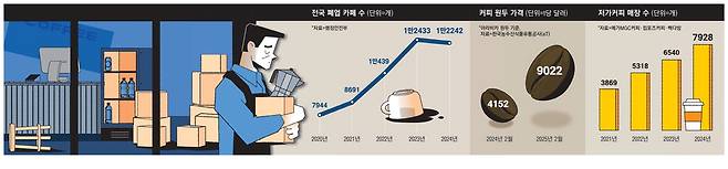 서울에서 테이크아웃 카페를 운영했던 A씨는 지난해 가게를 정리했다. 장사가 잘될 때는 월 매출 1000만원도 올렸지만 원두 가격, 아르바이트 비용 등 원가가 지속적으로 상승하며 한 달 순이익이 300만원에도 미치지 못했기 때문이다. 초기 투자 비용이 적고 특별한 기술 없이도 운영할 수 있어 많은 사람이 뛰어들었던 카페 창업이 이제는 '생존게임'이 됐다. 한 집 건너 카페가 넘쳐나도 호황 덕에 버티던 가게들이 경기 부진이 장기화하며 폐업으로 내몰리고 있는 것이다.