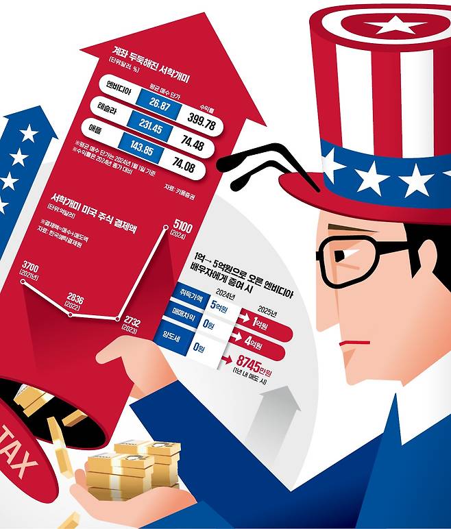 국내 주식과 달리 해외주식은 금액에 관계없이 연간 250만원을 초과하는 양도차익에 대해 22%의 소득세를 내야 한다. 이에 따라 엔비디아 투자를 통해 4억원의 수익을 올린 투자자라면 납부해야 할 양도소득세는 수익금 3억9750만원(수익금 4억원-기본 공제 250만원)의 22%인 8745만원(편의상 매매수수료 거래세 등 제외)에 달한다.