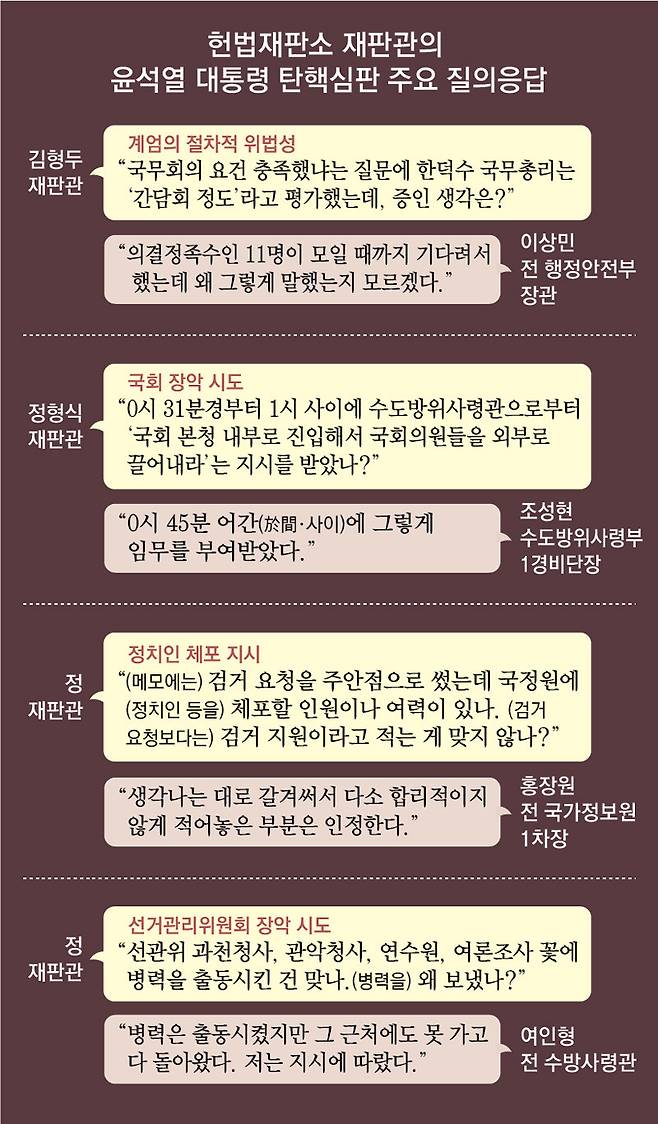 정 재판관이 “왜 보냈냐”고 묻자, 여 사령관은 “저는 지시에 따랐다”고만 했다. 수도권 고법의 한 부장판사는 “통상 재판관들의 직접 질문은 제출된 서면으로 해결되지 않는 핵심 쟁점에 대한 사실관계를 확정하기 위한 절차”라며 “헌법기관에 대한 장악 행위를 어떻게 판단하는지가 탄핵 인용 여부의 최대 쟁점이 될 것”이라고 말했다.