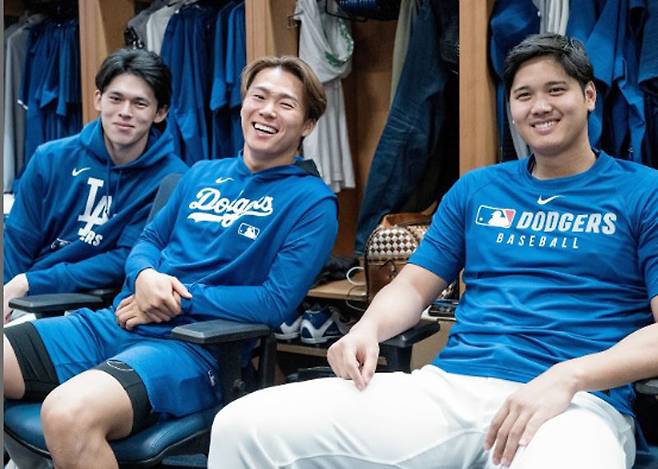 | LA 다저스 일본인 ‘선발 트리오’ LA 다저스의 일본인 선발투수 트리오 오타니 쇼헤이, 야마모토 요시노부, 사사키 로키(오른쪽부터)가 스프링캠프 라커룸에서 기념 사진을 찍었다. 사진 출처 LA 다저스 인스타그램 |