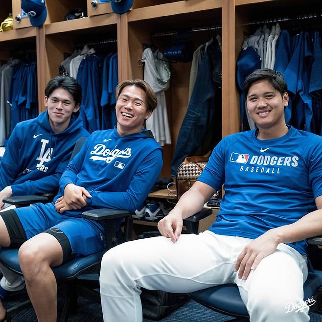 지난 15일(한국시간) 다저스 구단은 공식 SNS를 통해 한 장의 사진을 공개했다. 라커룸에서 촬영된 이 사진 속에는 사사키 로키, 야마모토 요시노부, 오타니 쇼헤이가 나란히 앉아 밝게 웃고 있었다. 단순한 스냅샷이 아니라, 올 시즌 다저스의 기대감을 한눈에 보여주는 장면이었다.