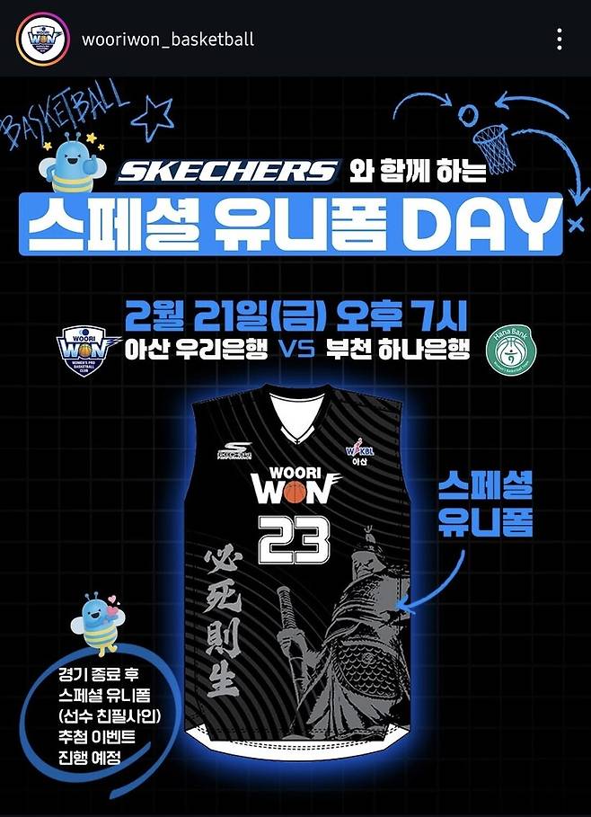 스페셜 유니폼도 준비했다. 우리은행은 아산에 충무공의 정신을 기리는 현충사와 이충무공 묘소 등이 자리하고 있다는 점에서 착안, 이순신 장군이 그려진 스페셜 유니폼을 제작했다. 이순신 장군의 좌우명이자 임진왜란 임전훈인 ‘필사즉생(必死則生)’도 새겨 플레이오프를 앞둔 선수단의 각오를 담았다.