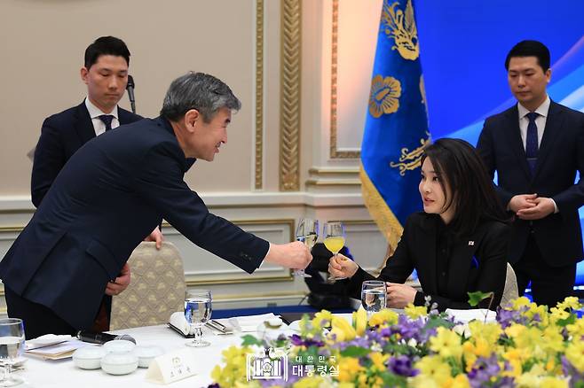 | ▲ 12·3 비상계엄 전날 김건희 여사와 조태용 국가정보원장이 문자메시지를 주고받는 사실이 확인되면서 '김건희 휴대폰'이 주목받고 있다. 사진은 2023년 3월 27일 윤 대통령 부부의 재외공관장 초청 만찬 당시 조태용 주미대사와 김 여사의 모습 |