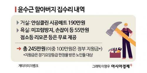 권 대표는 고령자 낙상예방 전문 사회적 기업인 해피에이징을 창업해 10년째 이 일을 하고 있다. 그는 "대부분 어르신이 돈을 아끼려고 100만원까지만 보수하는데 그 금액이면 거실 절반에 매트를 깔기도 힘들다"며 "고장 난 욕실 수전이나 전등 교체 정도로 그치는 경우가 많다"고 했다. 노인들의 집을 안전하게 꾸미는데 100만원은 턱없이 부족하다. 윤 할아버지 집에서는 자식들이 나섰다. 전용 84㎡ 규모 아파트를 수리하는 데 들어간 총비용은 245만원. 지원금 100만원을 뺀 나머지는 아들딸이 보탰다.