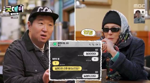 이를 들은 정형돈은 "네가 새벽에 술 먹고 나한테 연락했잖아. 너 언제까지 가짜로"라며 "네가 '혀엉'하고 간절하게 보냈어, 안 보냈어?"라고 어이없어했고, 지드래곤도 연락했음을 인정했다.