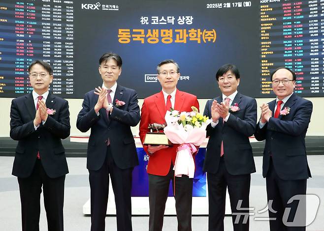 (서울=뉴스1) = 17일 오전 서울 영등포구 한국거래소에서 열린 동국생명과학 코스닥시장 상장기념식에서 김대영 한국IR협의회 부회장(왼쪽부터), 민경욱 한국거래소 코스닥시장본부장, 박재원 동국생명과학(주) 대표이사, 이성 NH투자증권 IB1사업부 대표, 강왕락 코스닥협회 부회장이 기념촬영을 하고 있다. (한국거래소 제공. 재판매 및 DB 금지) 2025.2.17/뉴스1