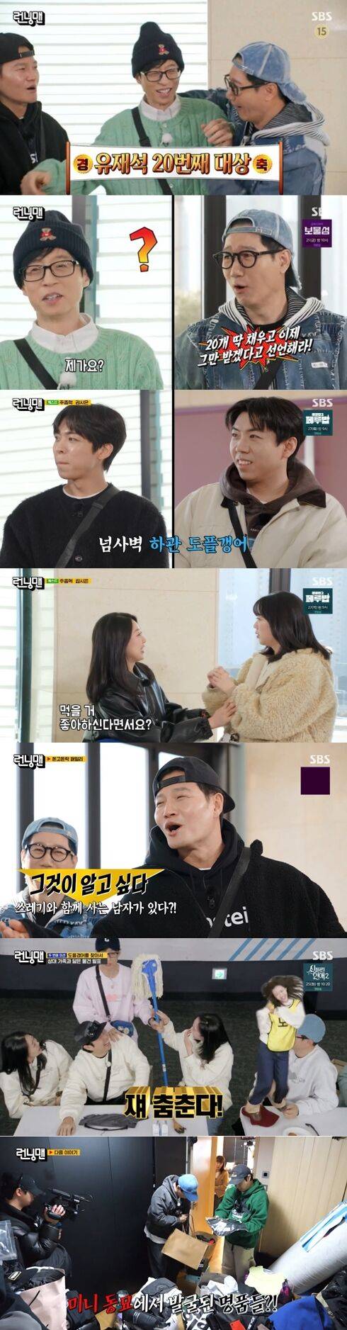 이날 방송 오프닝에서는 멤버 유재석의 20번째 연예대상 수상을 축하했다. 앞서 유재석은 '2024 SBS 연예대상'에서 대상을 수상하며 통산 20번째 대상을 들어 올렸고, 당시 수상소감에서 "여러분, 제가 해냈다"라고 기쁨을 표해 큰 화제가 된 바 있다. 하하는 "우리 형이 해냈다"라며 축하했고 김종국은 "대상 20번은 어떤 기분인 줄 모르겠다"라고 덧붙였다. 반면 지석진은 "20개 딱 채우고 이제 그만 받겠다고 선언해라"라고 권유해 웃음을 자아냈다.