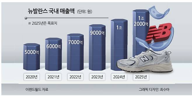 더 흥미로운 것은 뉴발란스가 아디다스를 제치고 국내 2위 스포츠 브랜드로 올라섰다는 사실입니다. 국내 소비자들이 운동화나 운동복을 살 때 나이키와 동일선상에 놓고 고민하는 브랜드가 됐습니다. 뉴발란스가 글로벌 시장에서 5~7위라는 점에 비춰 보면 괄목할 만한 성장이죠. 이랜드는 이에 그치지 않고 올해 매출 목표를 20% 올린 1조2000억원으로 잡았습니다.