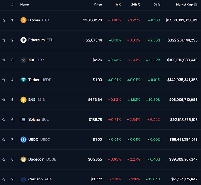 이더리움은 24시간 전 대비 0.83% 내린 2673.14달러를 기록 중인데, 7일 전과 비교해선 2.36% 상승했다. 이더리움도 지난 4일 이후 2500~2800달러 사이에서 거래되고 있다.