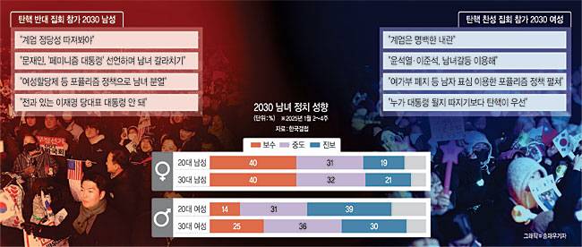 ◇‘민주주의 수호’ 뒤엔 엇갈린 남녀 인식 = 문화일보가 탄핵 찬·반 집회에 참여해온 2030세대 남녀 10명을 심층 인터뷰한 결과, 윤 대통령 탄핵을 놓고 여성들은 “반헌법적 비상계엄을 선포한 윤 대통령에 대한 탄핵은 당연하다”고 주장하는 반면, 남성들은 “비상계엄의 정당성을 법적으로 따져봐야 한다”고 주장했다. 국회 앞 찬탄 집회에 참석했던 김현지(여·35) 씨는 “대통령은 계엄을 선포할만한 비상상황이 아니었음에도 시민들을 위험한 상황에 놓이게 했다. 명백한 내란 행위”라며 “헌재가 탄핵을 인용해야 한다”고 말했다. 광화문 반탄 집회에 참여한 서울대 재학생 김모(23) 씨는 “일국의 대통령이 충동적으로 계엄선포를 했을 거라고 생각하지 않았기에 계엄 선포문을 수십 번 읽어봤다”며 “정당성을 따지기에는 법적 절차가 진행되고 있어서 섣불리 말하기 어렵지만 민주당의 횡포를 고려해보면 심정적으로 이해가 간다”고 말했다.