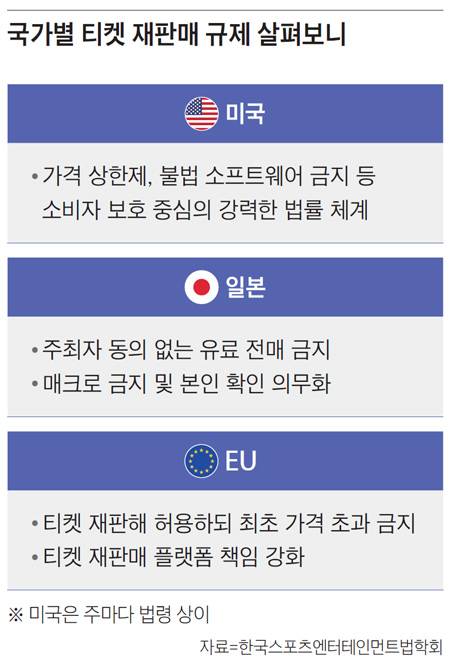 해외에서는 매크로를 활용한 불법 행위는 금지하되, 티켓 재판매는 명시적으로 허용하고 있다. 2025년 1월 한국스포츠엔터테인먼트법학회가 미국, 캐나다, 영국, 일본, 유럽연합(EU) 등 주요국을 분석한 결과다. 일례로 EU는 티켓 재판매를 허용하지만, 플랫폼 책임을 강화하고 정보 공개와 소비자 권리 보호를 강조하는 데 초점을 두고 있다.
