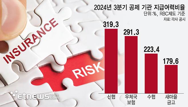 작년 3분기 기준 신협공제 RBC비율은 319.3%, 우체국보험은 291.3%, 수협 223.4%, 새마을금고는 179.6%를 기록해 모두 규제 수준(100%)을 웃돌고 있다.