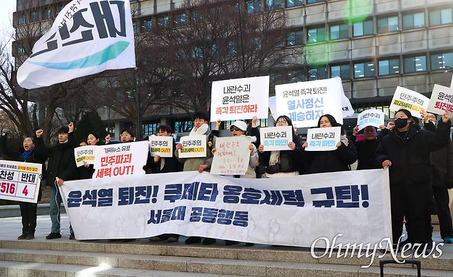| ▲ ‘윤석열 퇴진! 쿠데타 옹호세력 규탄! 서울대공동행동’ 주최 집회가 17일 오전 서울 관악구 서울대 아크로폴리스광장에서 열렸다. 집회를 마친 참가자들이 윤석열 지지자들의 탄핵 반대 집회가 열리는 학생회관 앞으로 행진해 규탄하고 있다. |