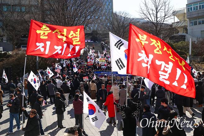 | ▲ 17일 오전 서울 관악구 서울대 학생회관앞에서 자유민주주의를 수호하는 서울대인 주최로 윤석열 대통령 탄핵반대 집회가 열렸다. 이날 집회에는 서울대생이 아닌 윤석열 대통령 지지자 수백명이 참석했다. |
