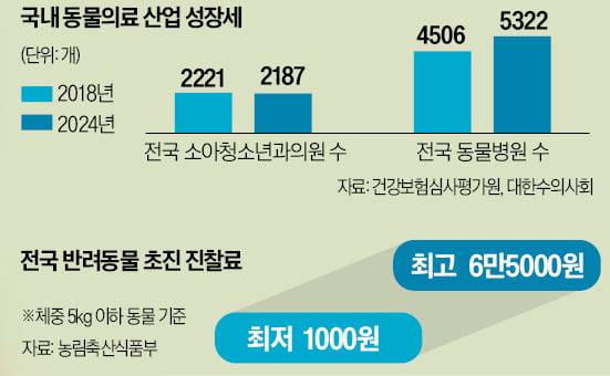 17일 대한수의사회에 따르면 전국 동물병원 수는 2018년 4506개에서 지난해 5322개로 18.1% 증가했다. 같은 기간 전국 소아청소년과의원은 2221개에서 2187개로 1.5% 줄었다. 전국 동물병원 수가 2024년 기준으로 소아과의 2.4배 규모로 커진 것이다.