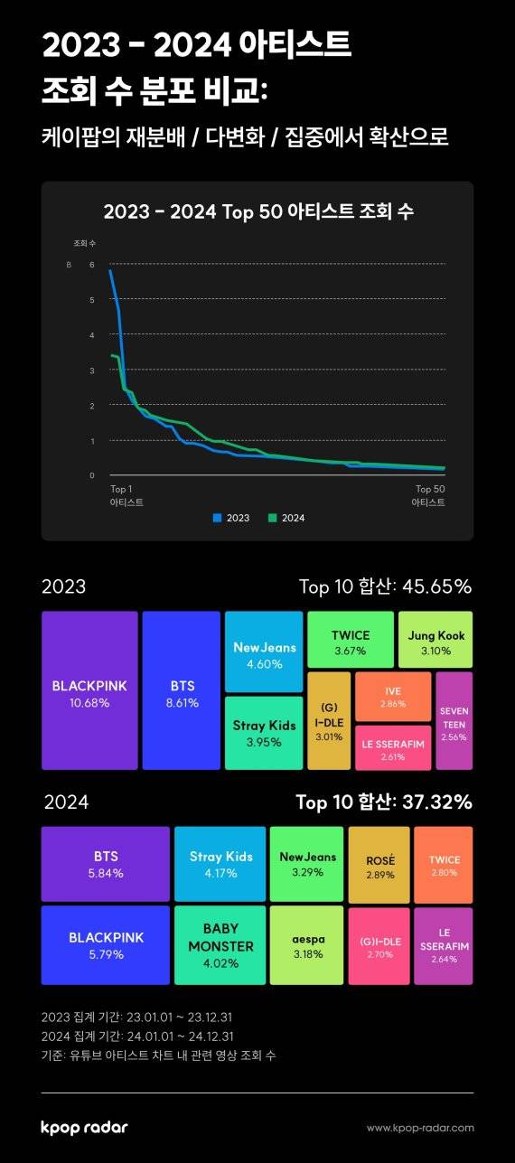 2023년과 2024년 케이팝 아티스트 조회 수 비중을 비교한 결과, 2024년에는 Top 10 아티스트가 차지하는 비중이 45.65%에서 37.32%로 감소했다. 이는 특정 아티스트에 대한 소비 집중이 완화되고, 케이팝이 기존의 '올인형' 소비 방식에서 여러 아티스트를 동시에 응원하는 '멀티스탠'과 특정 아티스트의 팬이 아니더라도 가볍게 음악을 즐기는 '캐주얼 팬' 중심으로 변화하고 있음을 보여준다고 케이팝레이더는 분석했다.