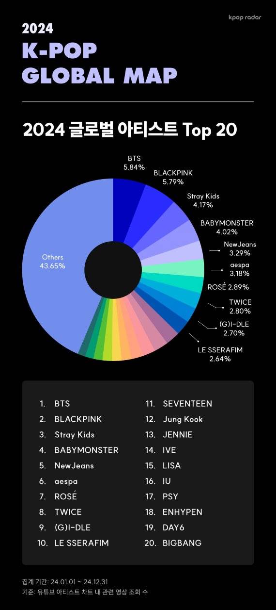 방탄소년단이 2024 글로벌 아티스트 Top 20에서 다시 한번 1위를 차지하며, 군 복무로 인한 공백기에도 여전히 강력한 존재감을 증명했다. 블랙핑크는 2위에 올라 케이팝 대표 걸그룹으로서의 막강한 영향력을 이어갔다. 이어 스트레이 키즈, 베이비몬스터, 뉴진스가 5위권 내에 진입하며 4세대 그룹의 저력을 보여줬고, 에스파, 로제, 트와이스, (여자)아이들, 르세라핌이 10위권에 안착했다.