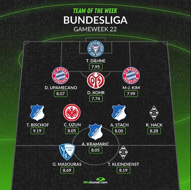 바이에른 팬들 입장에서는 소속 선수가 3명 선정된 것과 마찬가지인 기분이었다. 호펜하임의 20세 유망주 미드필더 비쇼프가 1골을 넣고 키 패스를 5개 뿌리는 맹활약으로 전체 평점 1위를 받았는데, 다음 시즌 바이에른으로 자유계약(FA) 이적할 것이 보스만 룰을 통해 이미 확정된 선수라서다. 비쇼프는 이번 시즌 분데스리가 3골 2도움을 기록 중이다.