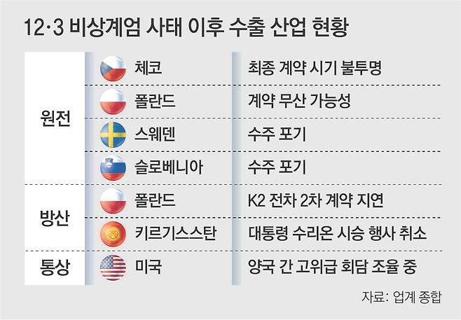 실제로 지난해 말 완료했어야 할 폴란드와의 K2 전차 2차 계약이 기술 이전 및 현지 생산 조건 등에서 이견을 보이며 지연되고 있다. 폴란드 정부가 요구하는 수출금융(대출)도 부처 간 의견 조정이 되지 않아 승인이 나지 않고 있다. 지난해 12월엔 수리온 도입을 검토 중이던 사디르 자파로프 키르기스스탄 대통령이 방한했지만 계엄 사태로 인해 시승 행사 등 모든 일정을 취소하고 귀국하기도 했다.