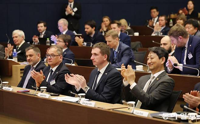 | 韓-체코 투자 콘퍼런스 루카시 블체크 체코 산업통상장관(앞줄 왼쪽에서 세 번째)이 17일 서울 중구 대한상공회의소에서 열린 ‘한-체코 투자 및 비즈니스 콘퍼런스’에 참석해 안덕근 산업통상자원부 장관(오른쪽)과 함께 박수를 치고 있다. 박형기 기자 oneshot@donga.com |