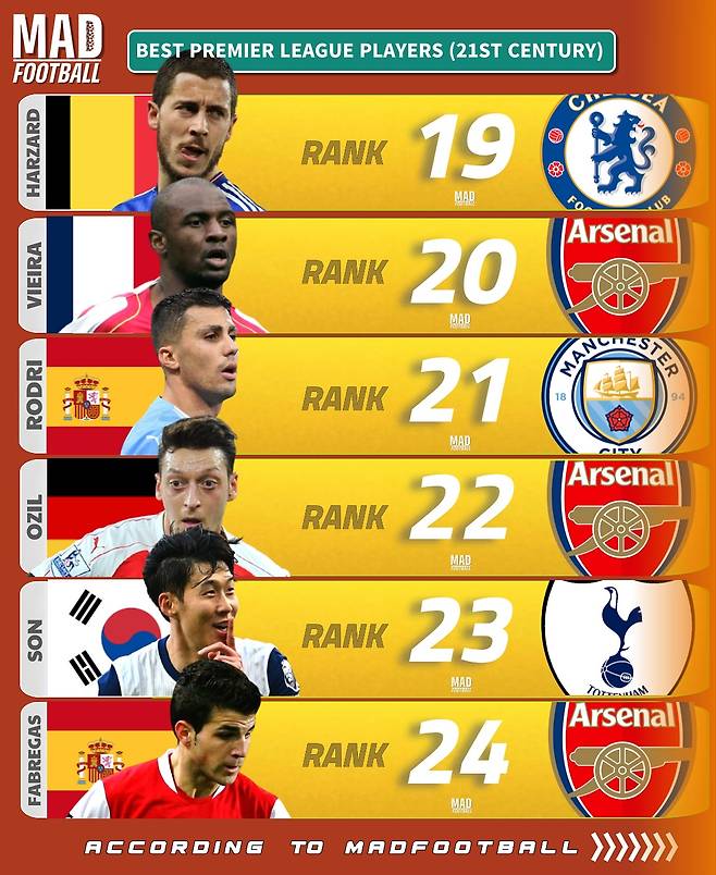 글로벌 축구 매체 '매드 풋볼'은 최근 21세기 프리미어리그 최고의 선수 24명을 선정했다. 손흥민이 이 안에 포함돼 눈길을 끈다.