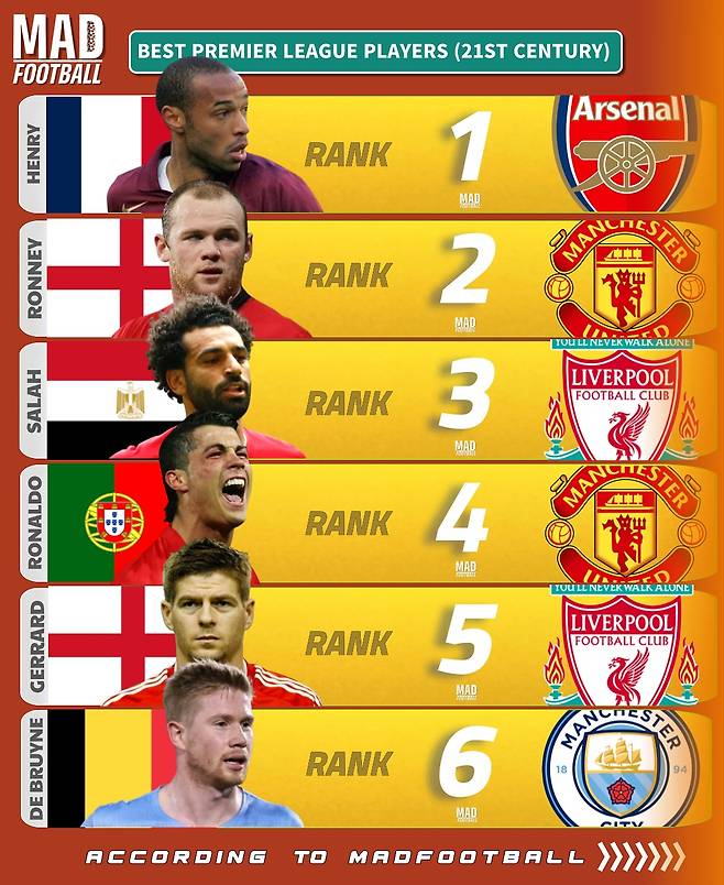 손흥민의 환상의 짝궁 해리 케인(바이에른 뮌헨)이 8위에 자리해 레전드들과 어깨를 나란히 했다. 5위는 스티븐 제라드(리버풀), 4위는 크리스티아누 호날두(맨체스터 유나이티드), 3위는 모하메드 살라(리버풀), 2위는 웨인 루니(맨체스터 유나이티드), 1위는 티에리 앙리(아스널)가 선정됐다.