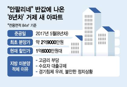 2017년 5월 준공된 경남 거제 '거제옥포도뮤토' 아파트 전용면적 84㎡는 1억6000만원대 매물이 나와있다. 준공 8년차를 맞이했지만 아직까지 남은 미분양 물량으로, 최초 분양가의 절반 수준에 '바겐세일'에 나선 것이다.