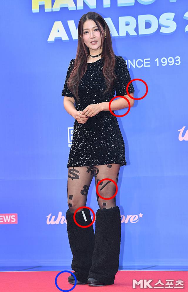 이날 시상식에서 황보는 블랙 스팽글 시퀸 미니드레스에 퍼 부츠, 그리고 골뱅이 @와 달러 $, 퍼센트 % 등 여러개의 기호가 프린팅된 파격적인 텍스트 스타킹을 매치해 팬들과 취재진들로부터 많은 플래시 세례를 받았습니다.
