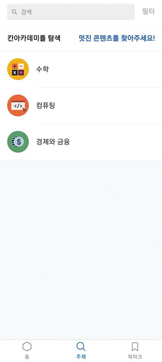 한국어 버전에서 수학 과목은 국내 학년별 수업을 제공한다. 초등학교 1학년부터 고등학교 수학Ⅰ, 수학Ⅱ, 미적분, 확률과 통계까지 전과정을 아우르며, 2015 개정 교육과정을 기준으로 설계되어 있다. 강의는 학년별로 세분화되어 체계적으로 구성되어 있으며, 각각 10분 내외의 짧은 동영상으로 만들어져 있어 바쁜 일상 속에서도 부담 없이 학습할 수 있다. 문제 풀이를 통해 자신의 실력을 바로 점검할 수 있는 기능도 있어서 학습 진도를 직접 관리하며 실질적인 성취감을 느낄 수 있다.